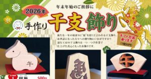 チラシ表面 干支商品の紹介チラシ(表面)になります。全6種類となっております。 チラシ裏面 定番商品をピックアップして掲載しております。今年の新商品もあります。 2024年末_申込用紙ダウンロード ニュース 干支商品 木工 工房ブログ 2024.11月号 工房ブログ 2024.12月号 関連記事 2026年 干支飾り「午」 2025-11-08 仕事内容の動画集 2024-06-28 2024年 干支飾り「辰」 2024-01-01 ホームページリニューアルしました。 2024-01-01